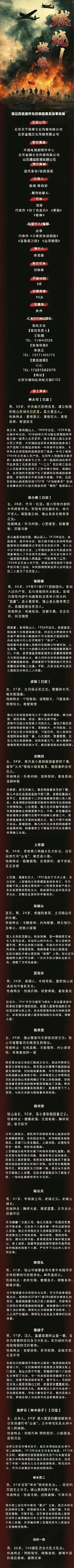 院线电影《燃烧!燃烧》根据真实故事改编,题材为近代革命与抗战谍战。该片计划3月在贵州开机,拍摄周期90天,总制片人兼编剧由甲与制片人栾茗媛共同推进项目。CASTING团队悠玖文化负责演员选拔,筹备地址位于北京市朝阳区尚屹文园E102。影片通过铭记历史与缅怀先烈,传递革命精神与爱国情怀。