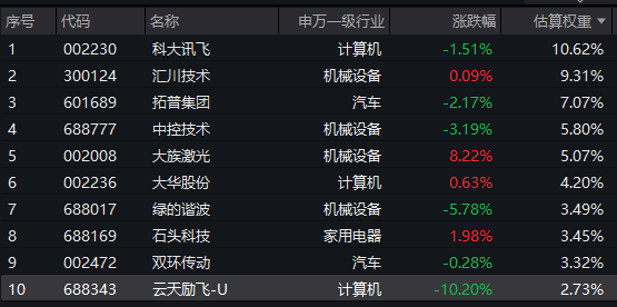 该ETF跟踪的中证机器人指数成分股表现分化。大族激光涨幅超过8%,石头科技上涨2%,汇川技术和大华股份小幅上扬;科大讯飞、拓普集团等则出现回调。成分股展示仅供参考,不构成投资建议。