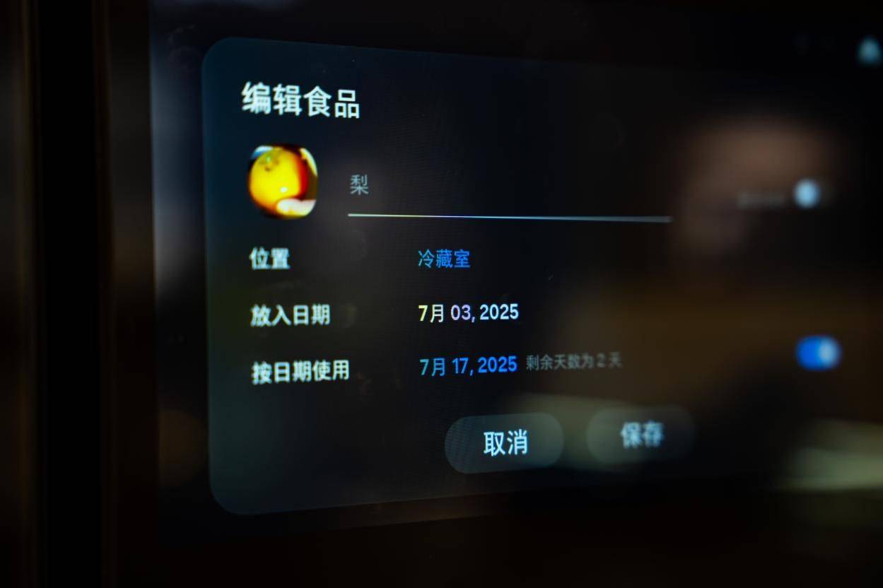 该冰箱的核心亮点在于其右侧门板上嵌入的9英寸AI智控大屏,这块屏幕承载了三星AI神冰箱9系的诸多核心AI功能。冰箱顶部的摄像头作为智慧管理员,能够智能识别并辨认用户放入的食材,自动收入到系统的食材库中,并计算食材的存放时长,提醒用户食材的临期情况。对于无法识别的包装食材,用户也可以手动添加。