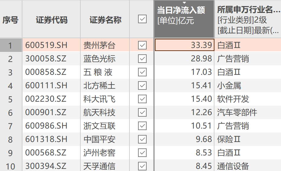 从行业分布来看,资金净流入前十的个股覆盖多个领域。除上述两家白酒企业外,稀土行业龙头北方稀土、人工智能领域代表企业科大讯飞、保险行业巨头中国平安均榜上有名。数字营销领域的蓝色光标、航天科技领域的航天科技、互联网传媒领域的浙文互联,以及通信设备制造商天孚通信和白酒企业泸州老窖也跻身前十。