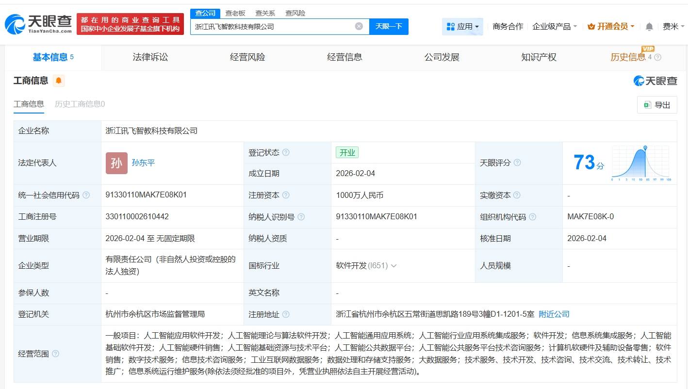 科大讯飞(002230)近日完成了一项重要布局——全资成立浙江讯飞智教科技有限公司。新公司法定代表人为孙东平,注册资本达1000万元人民币,业务范围聚焦人工智能领域,涵盖应用软件开发、理论与算法研究以及通用应用系统开发等多个方向。
