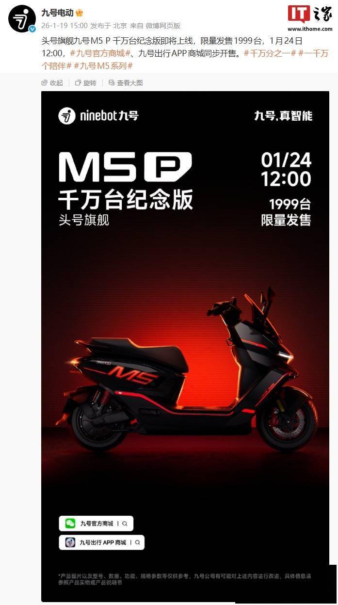 九号电动近日宣布,备受瞩目的头号旗舰车型——九号 M5 P 千万台纪念版即将正式登场。这款特别版车型将于1月24日中午12点开启限量发售,全球仅提供1999台,目前售价尚未对外公布。