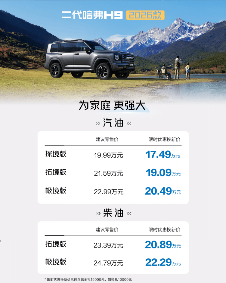 二代哈弗H9 2026款正式登陆市场,以19.99万至24.79万元的预售价格开启家庭越野新篇章。为回馈消费者,购车即享15000元现金优惠与10000元置换补贴,综合优惠后价格区间下探至17.49万至22.29万元。品牌还推出包含金融方案、终身质保、智能互联服务等在内的六重礼遇,全方位降低家庭用户的购车门槛。