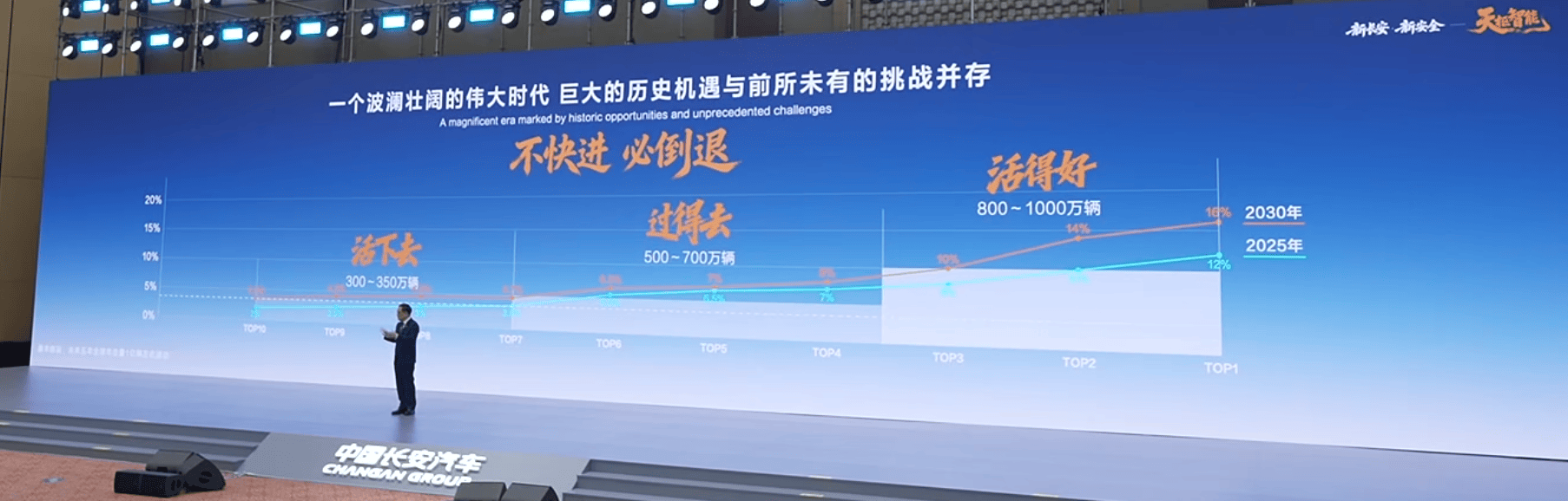 品牌整合战略同步推进。阿维塔与深蓝将通过"前端独立、中后端协同"模式实现技术、平台、制造等环节资源共享,预计降低成本20%-30%,目标到2030年打造全球规模突破150万辆的中高端品牌群,其中海外销量占比超40%。长安汽车董事长朱华荣明确提出,到2030年集团全球销量必保400万辆、奋斗500万辆,新能源产销目标240万辆以上,其中阿维塔50万辆、深蓝100万辆、长安品牌260万辆。