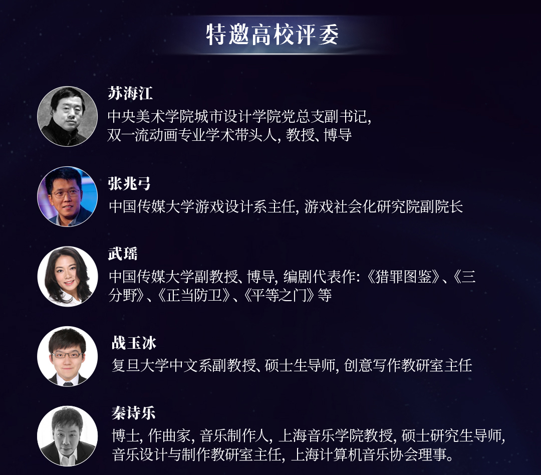 高校评审覆盖复旦大学、中国传媒大学、中央美术学院、上海音乐学院等国内外知名的高校教授,包括中央美术学院城市设计学院党总支副书记苏海江、中国传媒大学游戏设计系主任张兆弓、中国传媒大学戏剧影视文学系副教授、知名编剧武瑶、复旦大学中文系副教授战玉冰以及上海音乐学院教授秦诗乐,全面考察参赛者的创新能力、IP理解与专业水平。