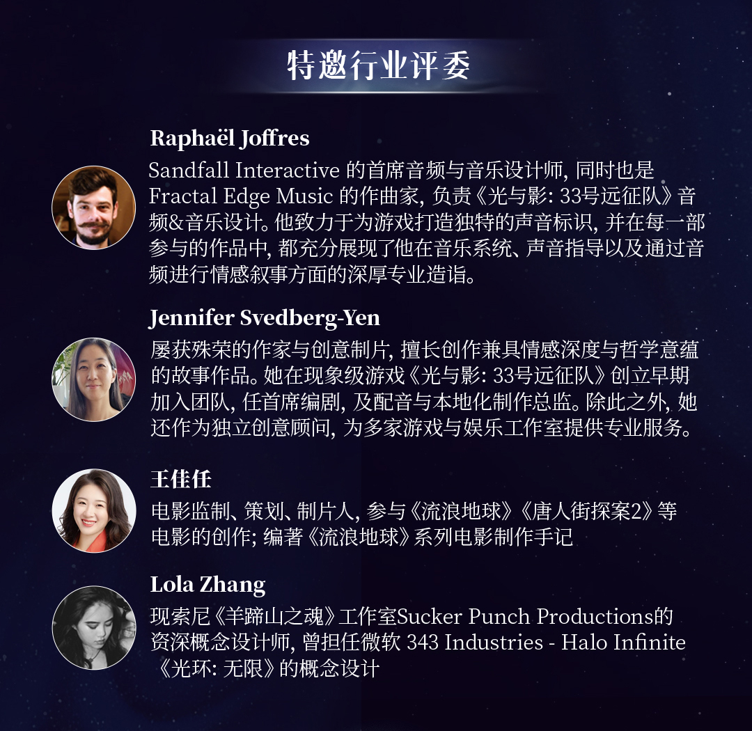 行业评审聚集了《光与影:33号远征队》、《羊蹄山之魂》、《流浪地球》等知名作品的创作成员,包括《光与影:33号远征队》首席音频音乐设计师Raphaël Joffres、首席编剧Jennifer Svedberg-Yen、《羊蹄山之魂》角色设计师Lola Zhang,以及《流浪地球》系列制作手记主编王佳任(朔方)。